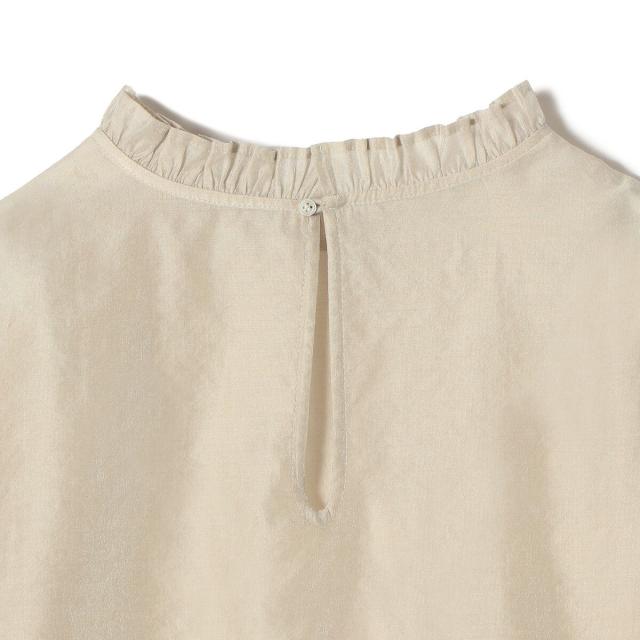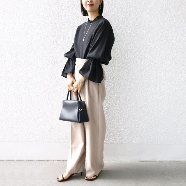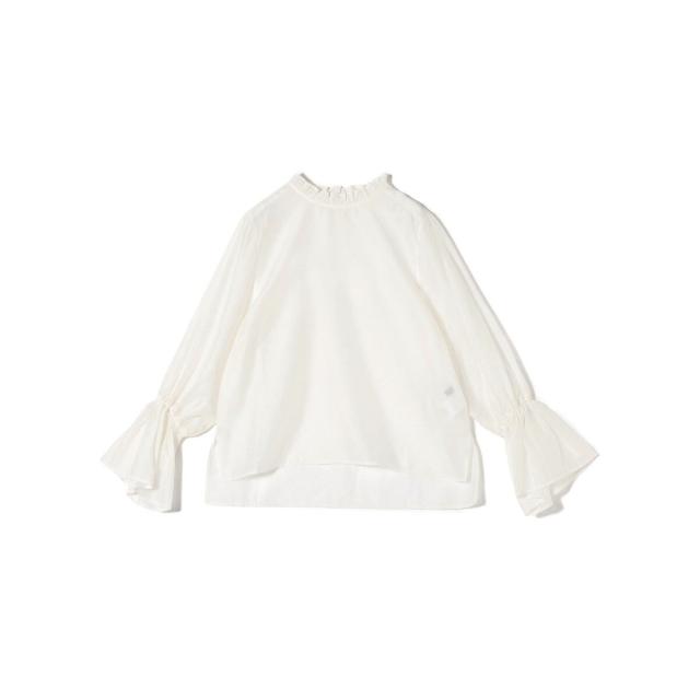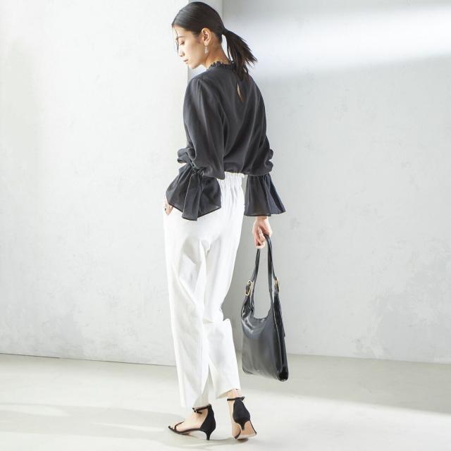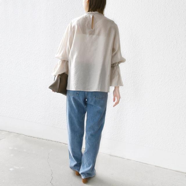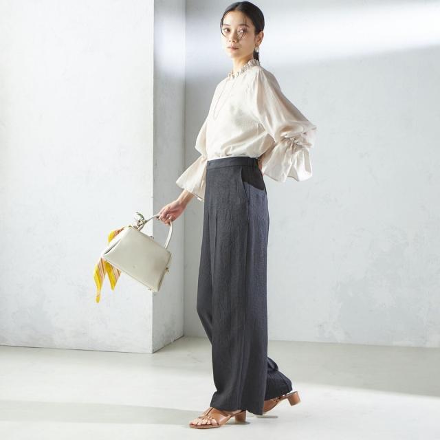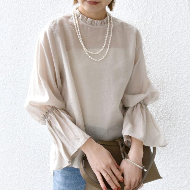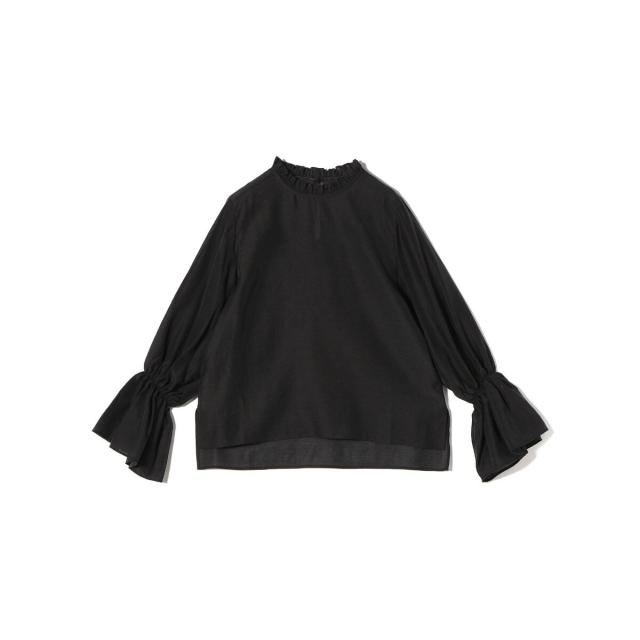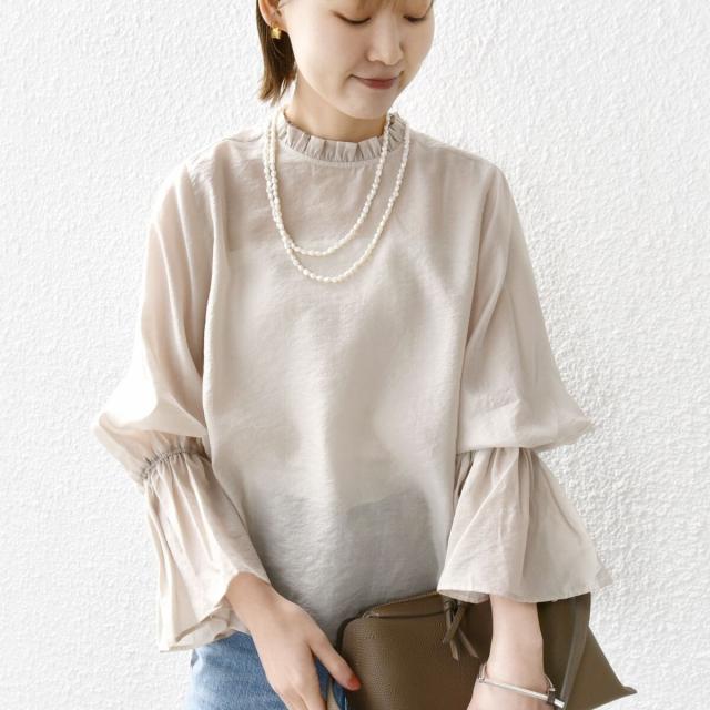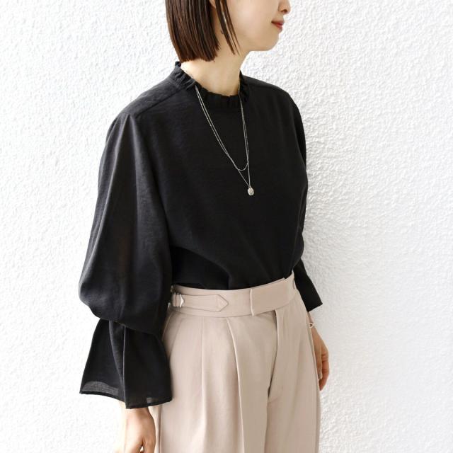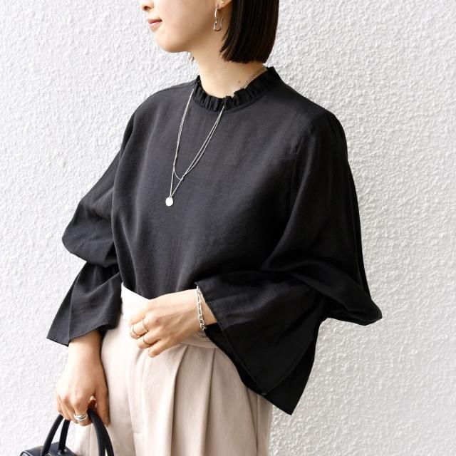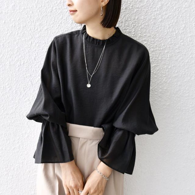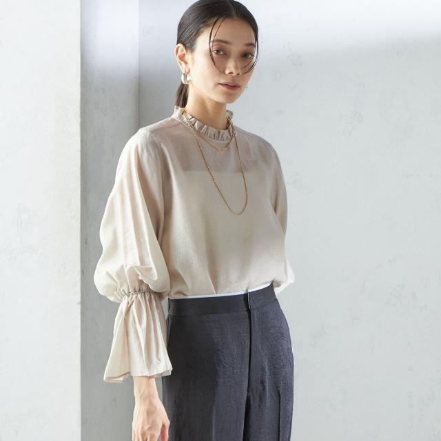 衿フリルと袖口のボリュームにこだわり、ジャケットインでも1枚でも華やかに見せてくれます。