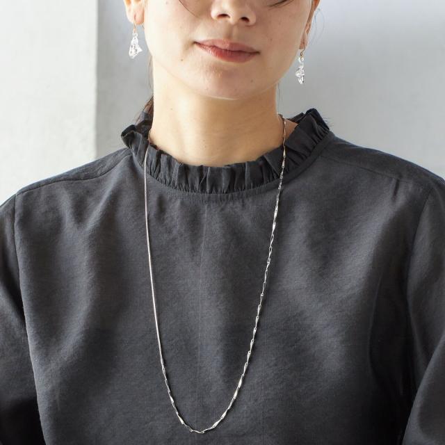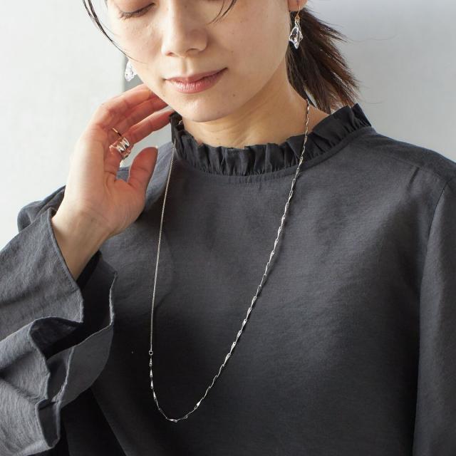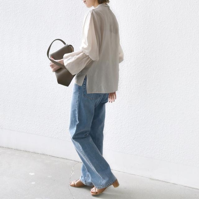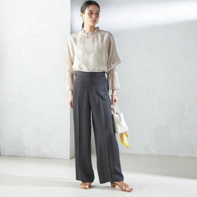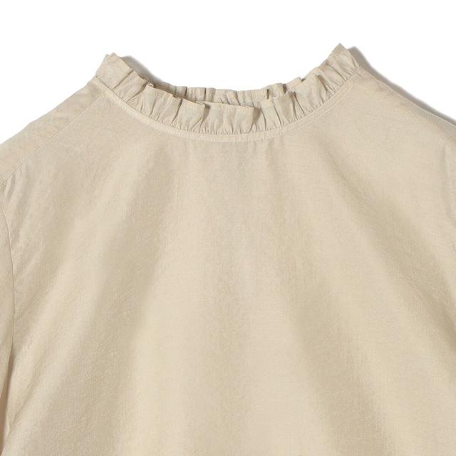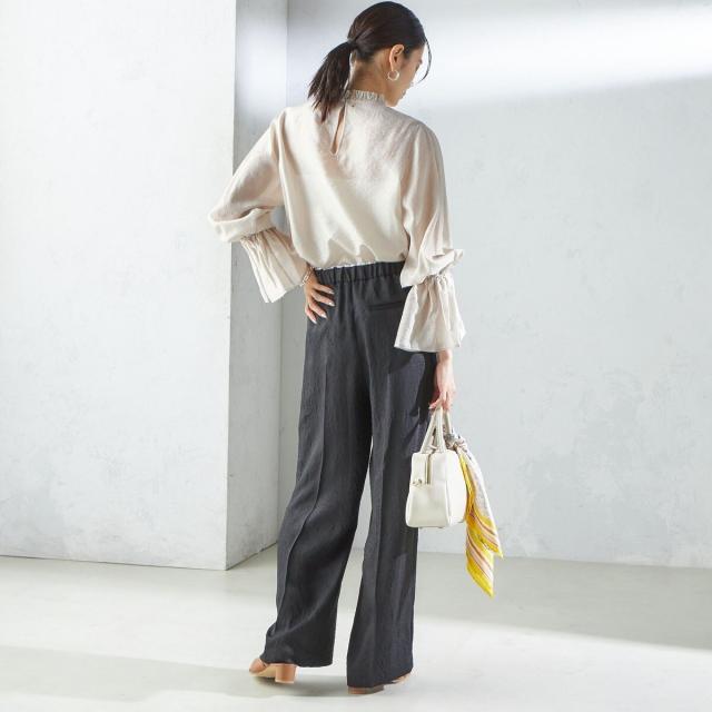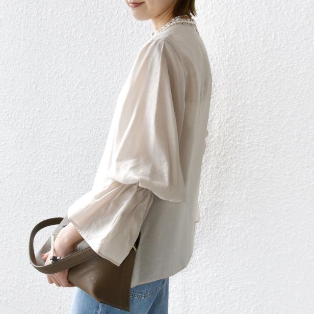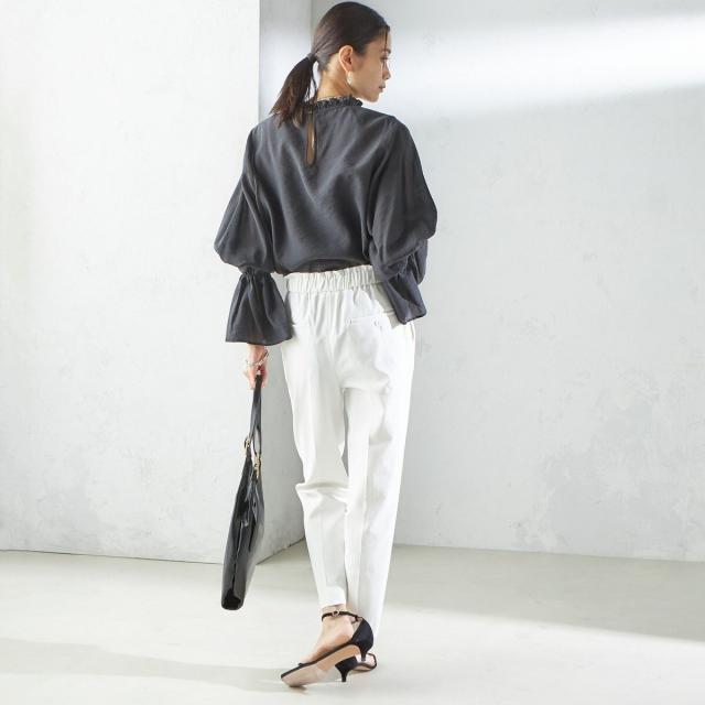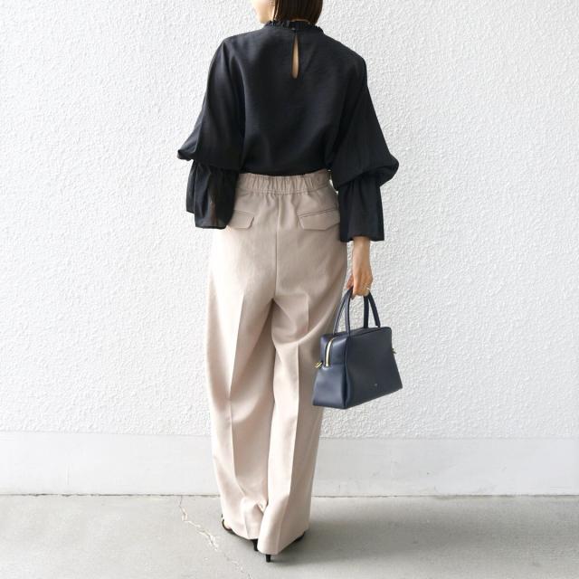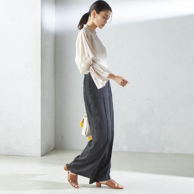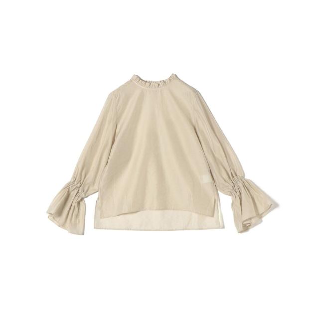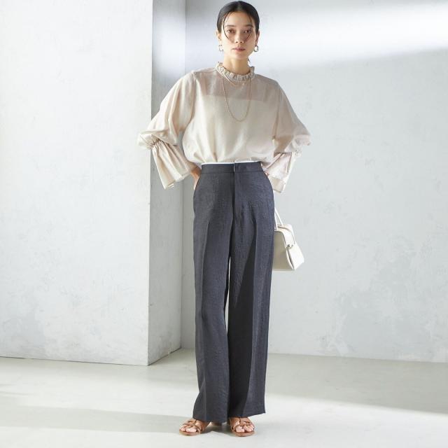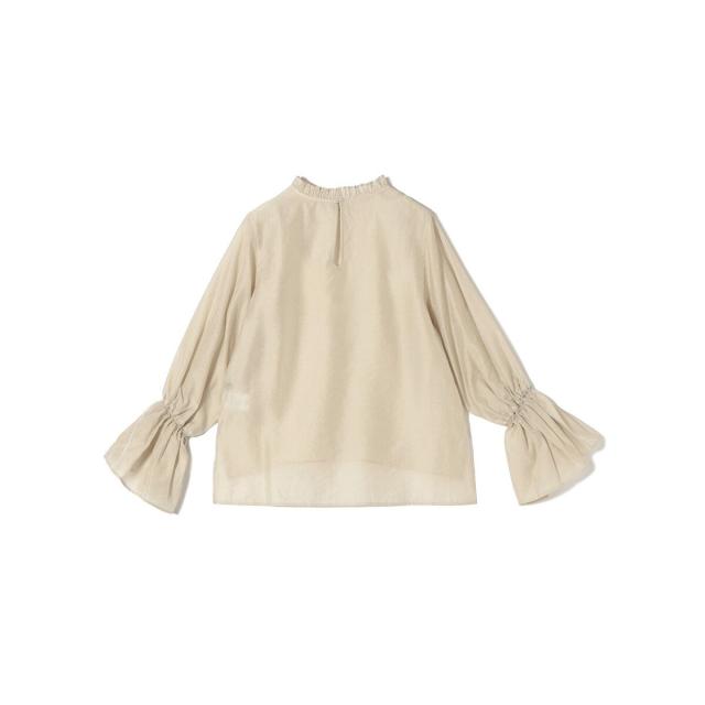 衿フリルと袖口のボリュームにこだわり、ジャケットインでも1枚でも華やかに見せてくれます。
