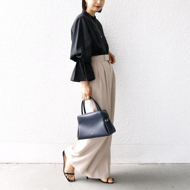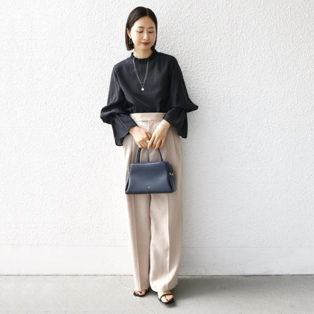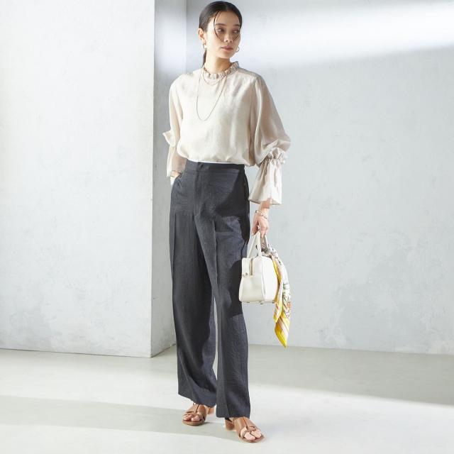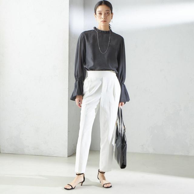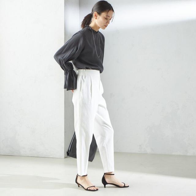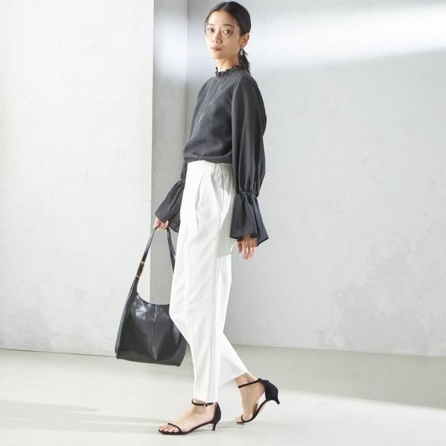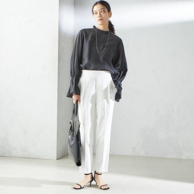 スラックスやテーパードパンツ、スカートなどボトムスを選ばず着回しの利く1枚です。
