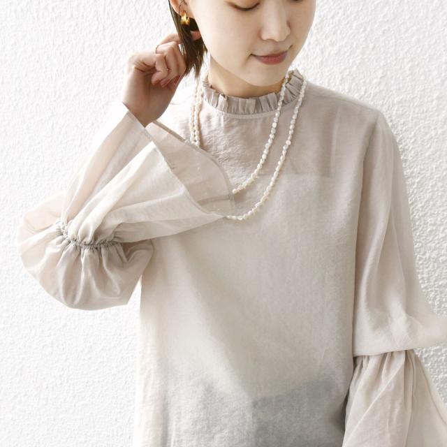 ほのかな光沢感と透けすぎないシアー素材が上品なデザインブラウス