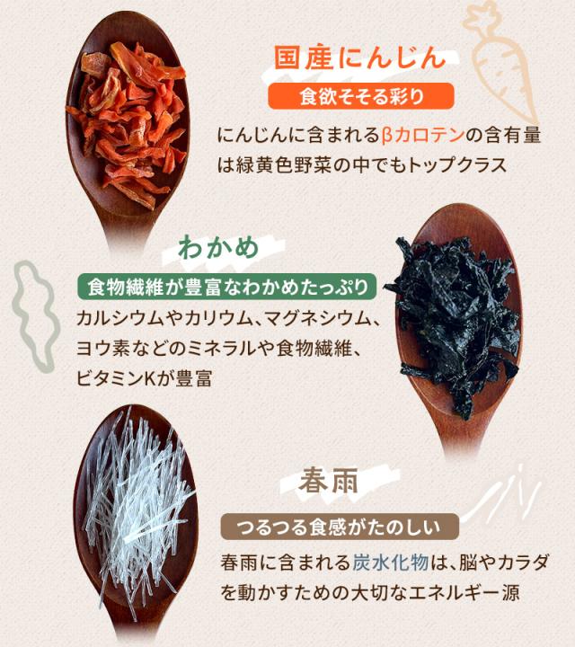 ■原材料 調味わかめ(砂糖、食塩、野菜香味調味料(食塩、野菜エキス粉末、乳糖、ポークエキス粉末、その他)、酵母エキス調味料、たん白加水分解物加工品、粉末醤油、具(乾燥わかめ))(国内製造)、乾燥キャベツ(キャベツ(国内産)、ブドウ糖)、春雨(緑豆でん粉)、刻み昆布(昆布(国内産)、醸造酢)、乾燥人参(人参(国内産)、ブドウ糖)/調味料(アミノ酸等)、香料、カラメル色素、酸味料、香辛料抽出物、甘味料(カンゾウ、ステビア)、(一部に小麦・乳成分・大豆・鶏肉・豚肉・ゼラチンを含む)