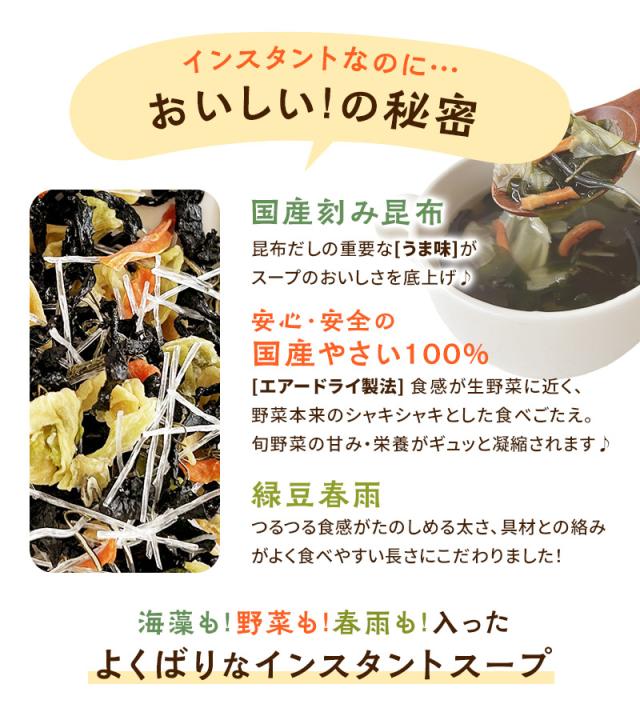 [3袋セット] スープ 国産やさいと海藻をもりもり食べるホッ。とスープ 大袋 165g×3袋 わかめ 昆布 春雨 キャベツ にんじん 野菜香味だし 洋風スープ 即席スープの素 インスタント たっぷり約27杯分 お得
