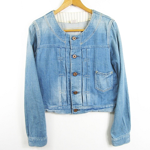 【中古】ドミンゴ Domingo DMG ノーカラー デニム ジャケット 綿 2 ライトブルー kz11133 レディース