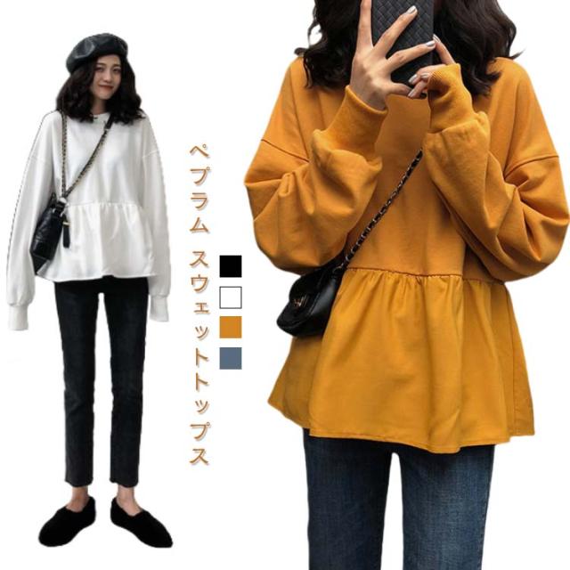 スウェット レディース 春 夏 春夏 白 黒 トレーナー カットソー ブラウス トップス 長袖 チュニック ペプラムトップス ゆったり ビッグシルエット ペプラム ホワイト ブラック キャメル ブルー 大人 体型カバー オフィス 20代 30代 40代 ママ 母 OL