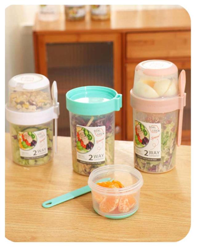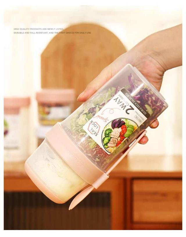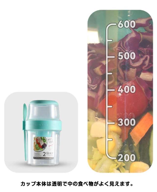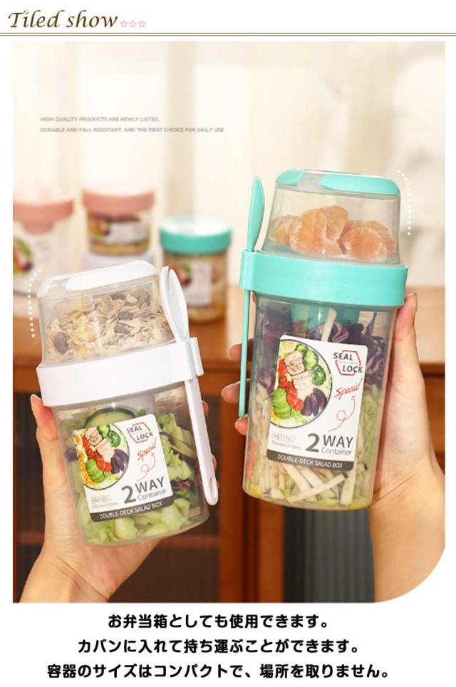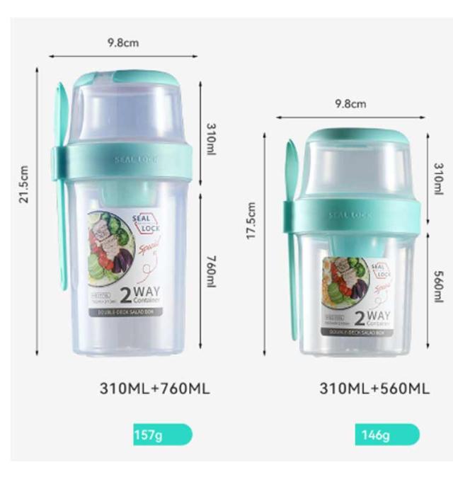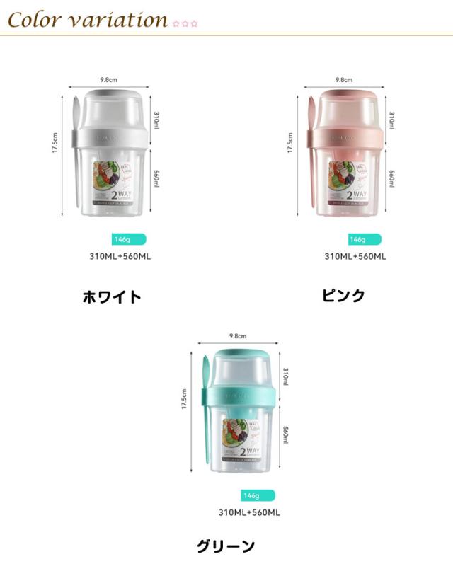 | 容器はボトル型で、持ち運びに非常に便利です。サラダ、フルーツ、スナック、牛乳などに使用できます。 ソースカップとフォークが付属しています。 カップ本体は透明で中の食べ物がよく見えます。 容器の上部にはドレッシングを入れるカップが付いています。 容器は安心して使用できる素材で作られています。 フタを閉めると、シェイクしてドレッシングを混ぜることができます。 容器はお弁当袋に入れやすいサイズです。 ピクニックや外出先での使用に最適です。 便利でスタイリッシュなデザインです。 手で持ちやすい形状です。 お弁当箱としても使用できます。 カバンに入れて持ち運ぶことができます。 容器のサイズはコンパクトで、場所を取りません。 | |