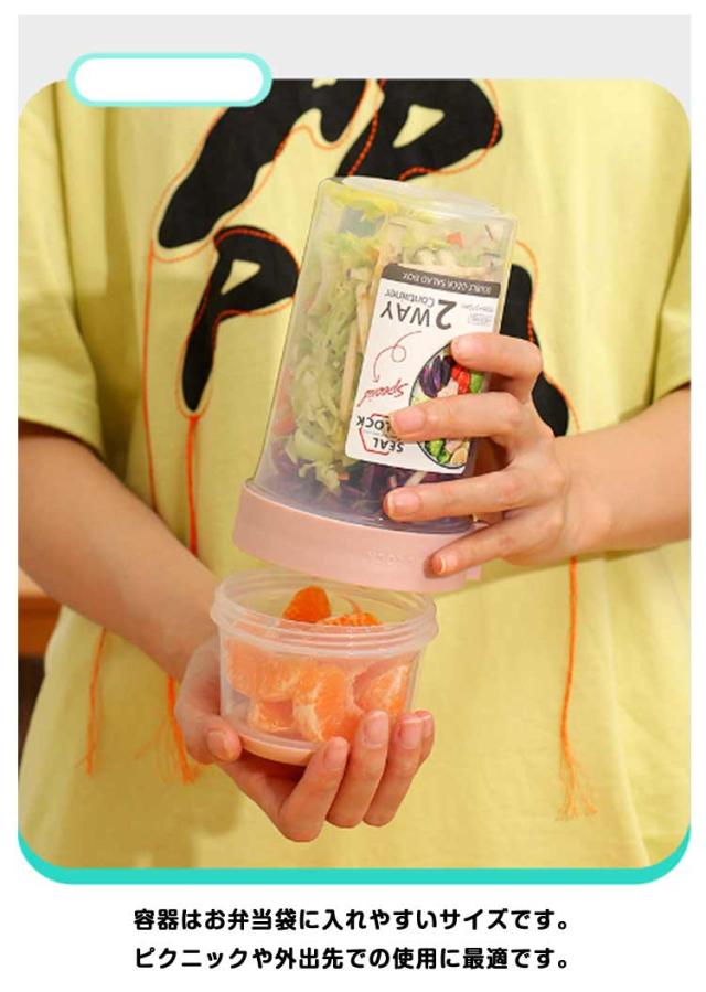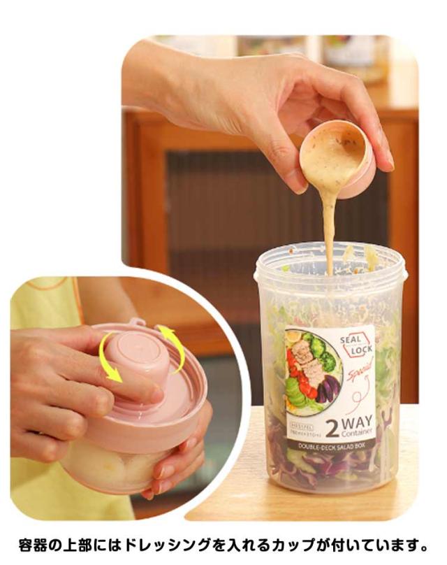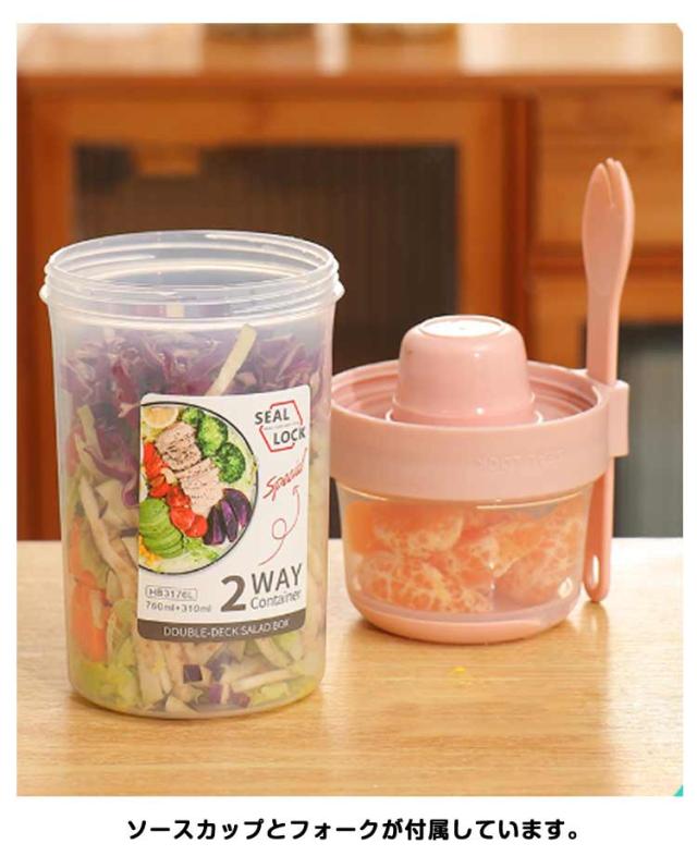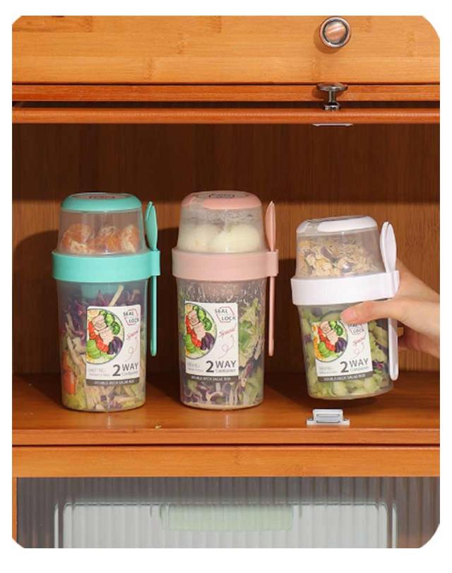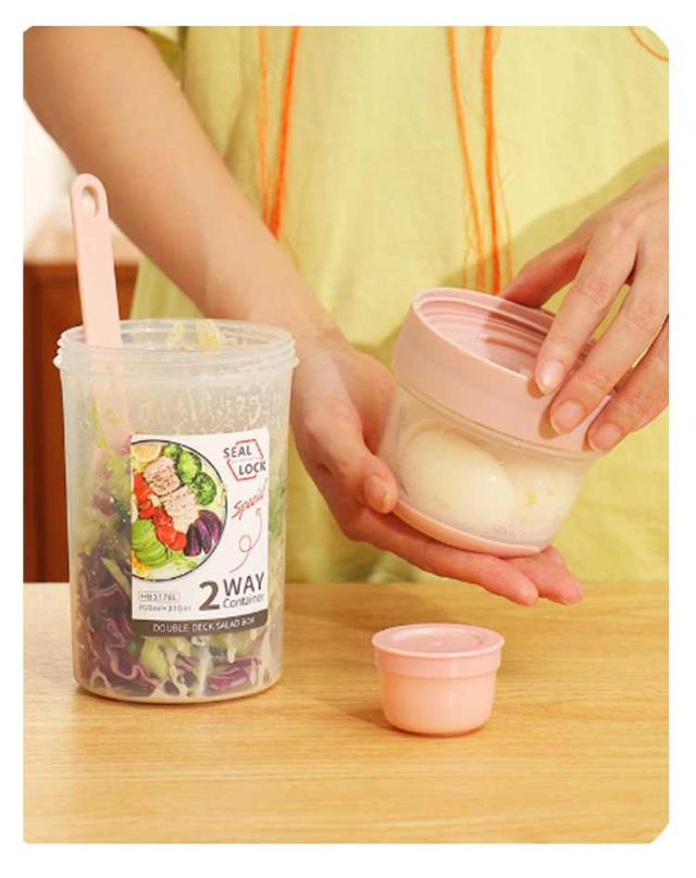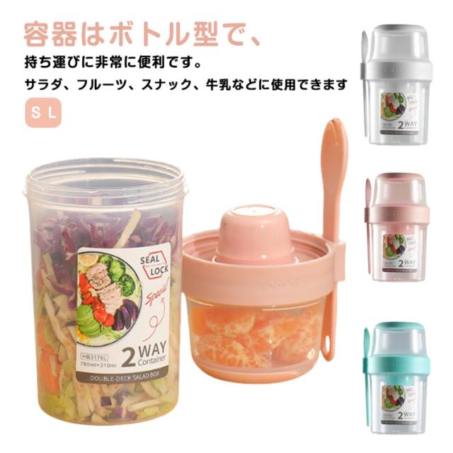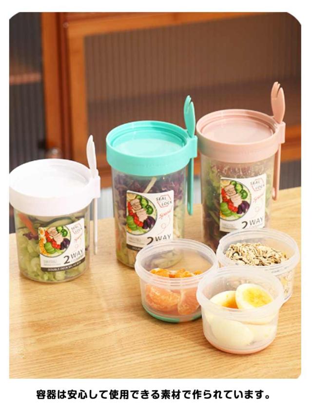 | 容器はボトル型で、持ち運びに非常に便利です。サラダ、フルーツ、スナック、牛乳などに使用できます。 ソースカップとフォークが付属しています。 カップ本体は透明で中の食べ物がよく見えます。 容器の上部にはドレッシングを入れるカップが付いています。 容器は安心して使用できる素材で作られています。 フタを閉めると、シェイクしてドレッシングを混ぜることができます。 容器はお弁当袋に入れやすいサイズです。 ピクニックや外出先での使用に最適です。 便利でスタイリッシュなデザインです。 手で持ちやすい形状です。 お弁当箱としても使用できます。 カバンに入れて持ち運ぶことができます。 容器のサイズはコンパクトで、場所を取りません。 | |