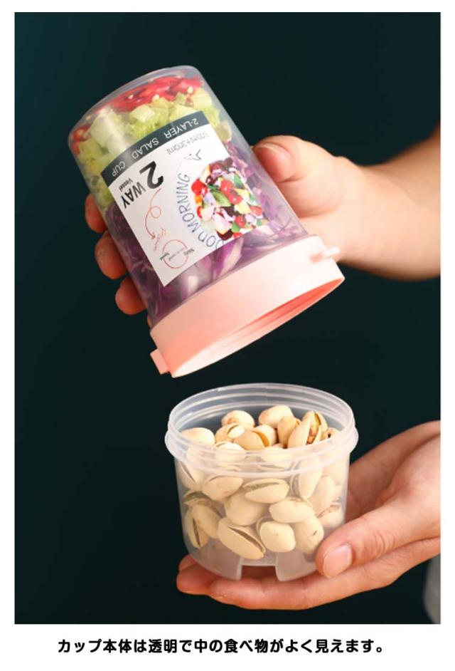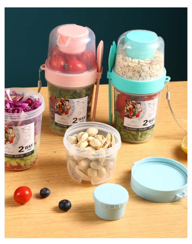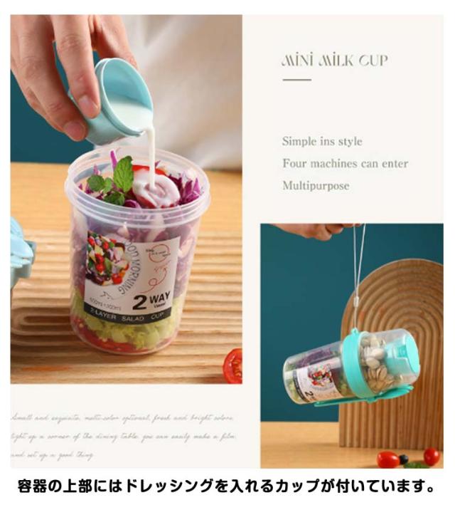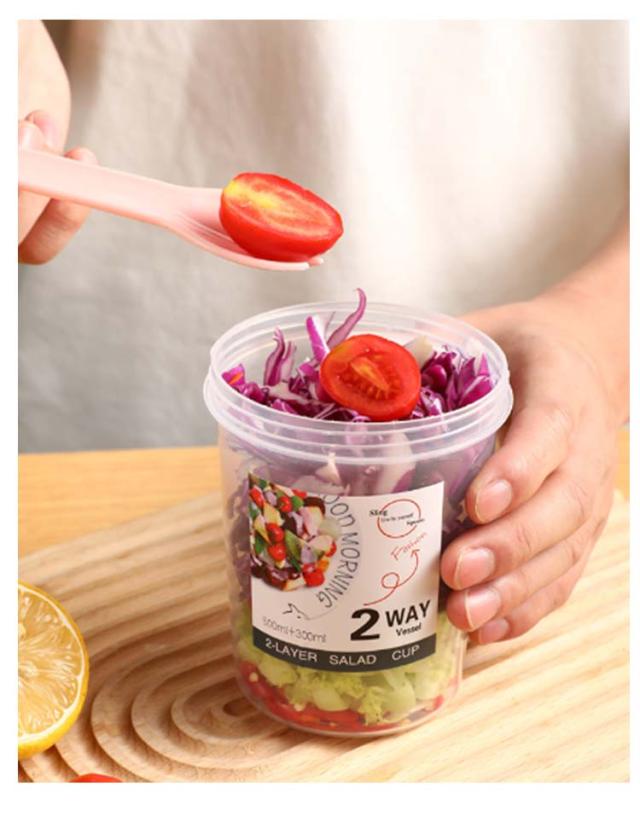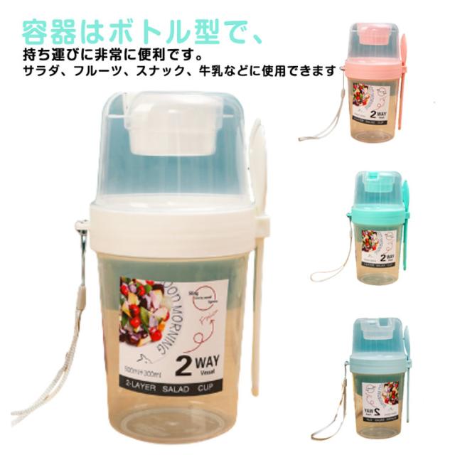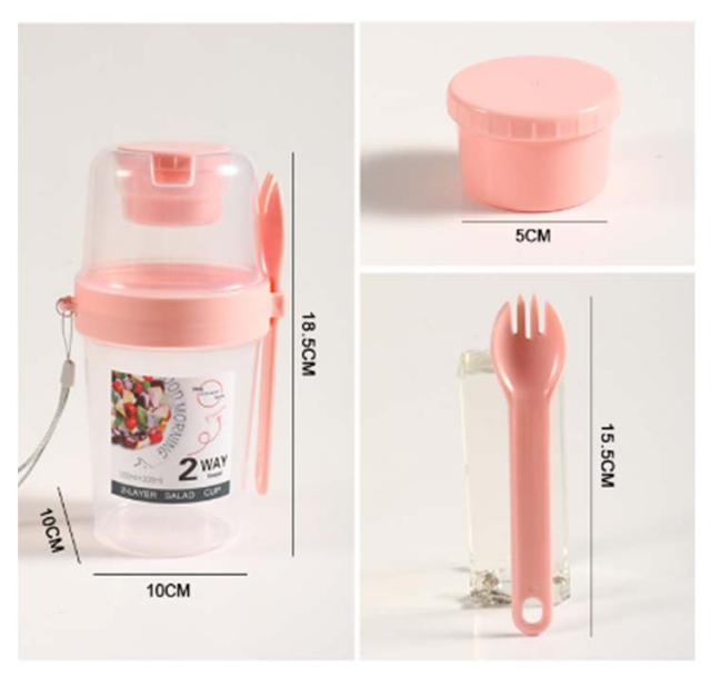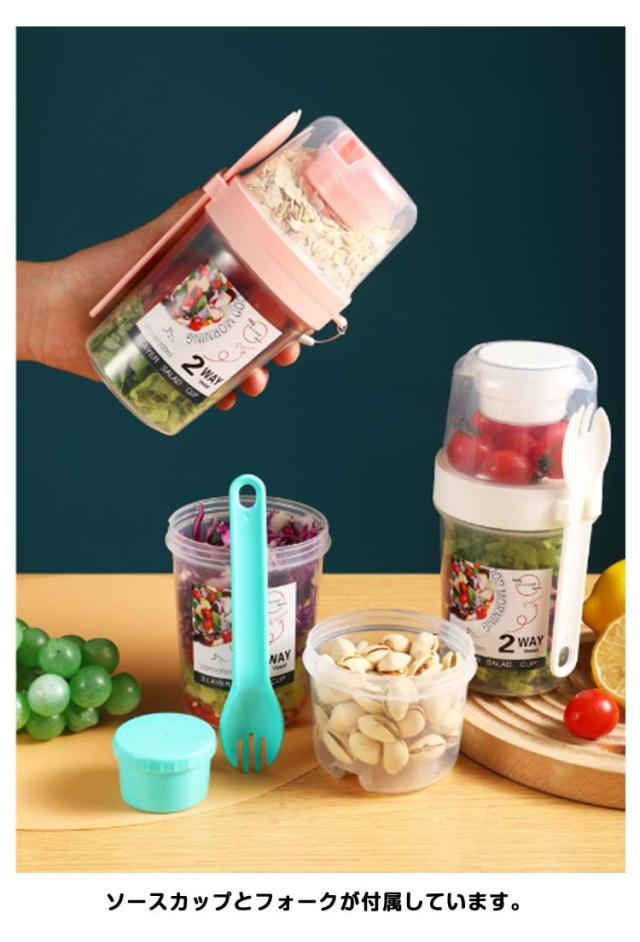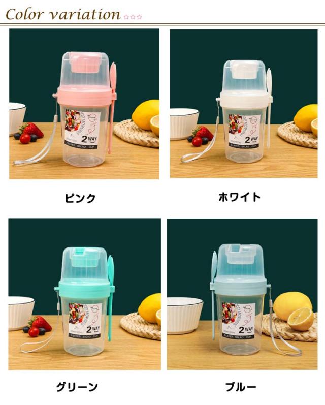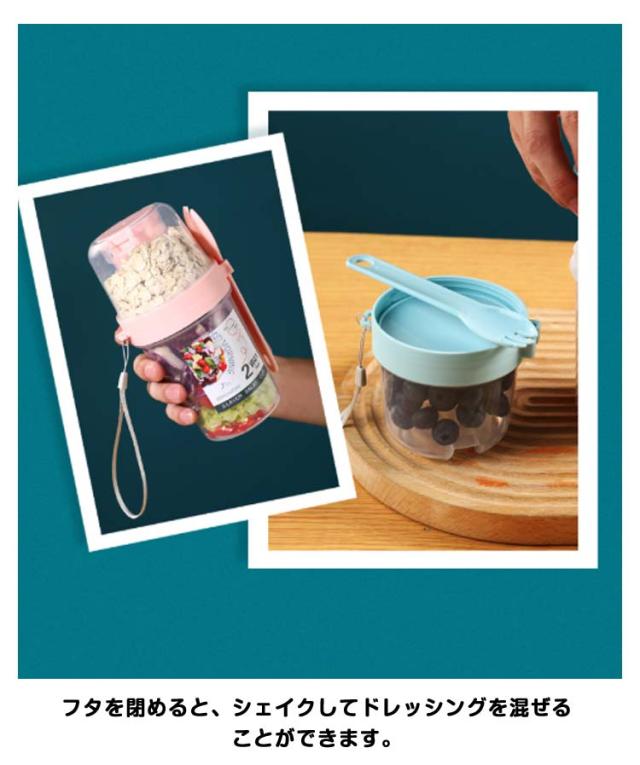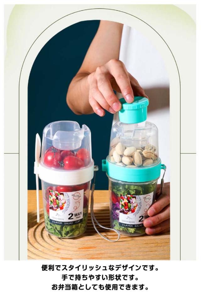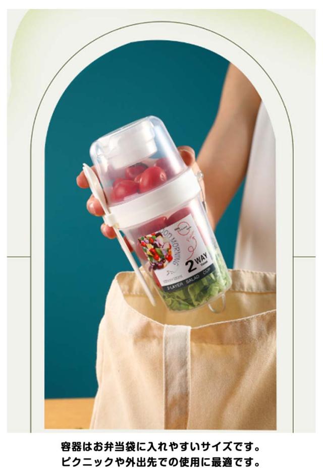 | 容器はボトル型で、持ち運びに非常に便利です。サラダ、フルーツ、スナック、牛乳などに使用できます。 ソースカップとフォークが付属しています。 カップ本体は透明で中の食べ物がよく見えます。 容器の上部にはドレッシングを入れるカップが付いています。 容器は安心して使用できる素材で作られています。 フタを閉めると、シェイクしてドレッシングを混ぜることができます。 容器はお弁当袋に入れやすいサイズです。 ピクニックや外出先での使用に最適です。 便利でスタイリッシュなデザインです。 手で持ちやすい形状です。 お弁当箱としても使用できます。 カバンに入れて持ち運ぶことができます。 容器のサイズはコンパクトで、場所を取りません。 | |