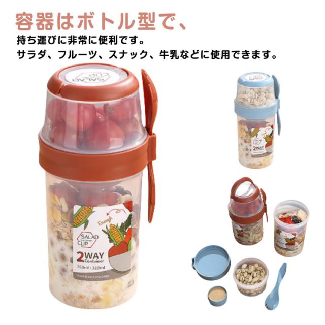 | 容器はボトル型で、持ち運びに非常に便利です。サラダ、フルーツ、スナック、牛乳などに使用できます。 ソースカップとフォークが付属しています。 カップ本体は透明で中の食べ物がよく見えます。 容器の上部にはドレッシングを入れるカップが付いています。 容器は安心して使用できる素材で作られています。 フタを閉めると、シェイクしてドレッシングを混ぜることができます。 容器はお弁当袋に入れやすいサイズです。 ピクニックや外出先での使用に最適です。 便利でスタイリッシュなデザインです。 手で持ちやすい形状です。 お弁当箱としても使用できます。 カバンに入れて持ち運ぶことができます。 容器のサイズはコンパクトで、場所を取りません。 | |