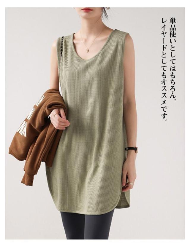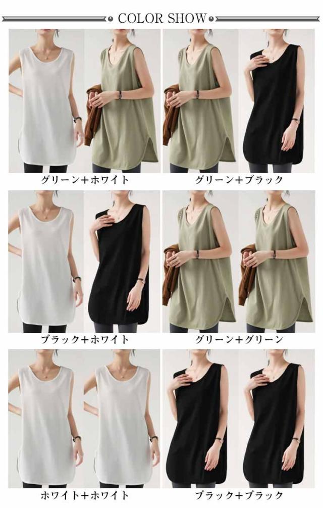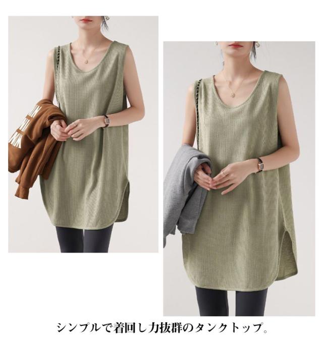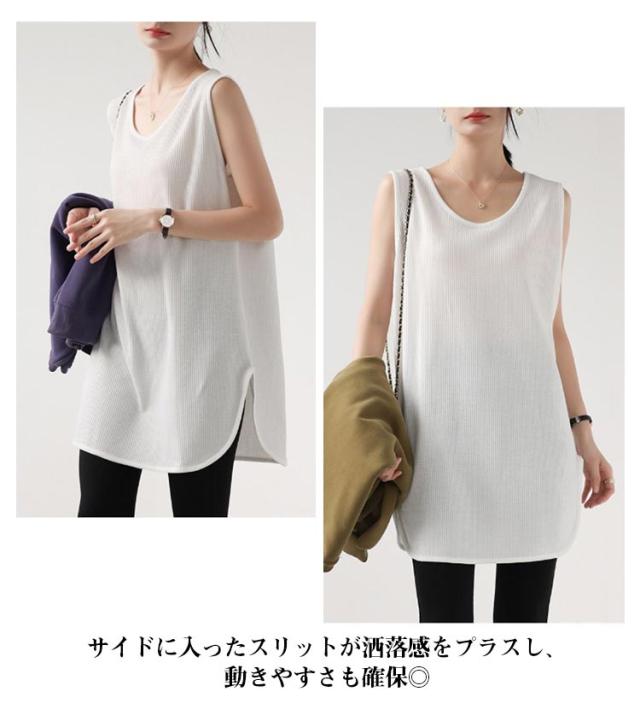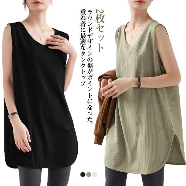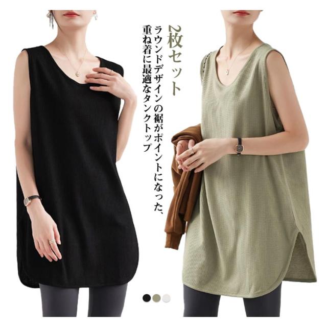 ロングタンクトップ ロング丈 レディース タンクトップ タンクトップ レイヤード 2枚セット 肌着 ラウンド裾 重ね着 お尻カバー インナー トップス ゆったり サイドスリット ラウンドネック 大きいサイズ ワッフル素材 無地 シンプル