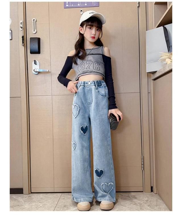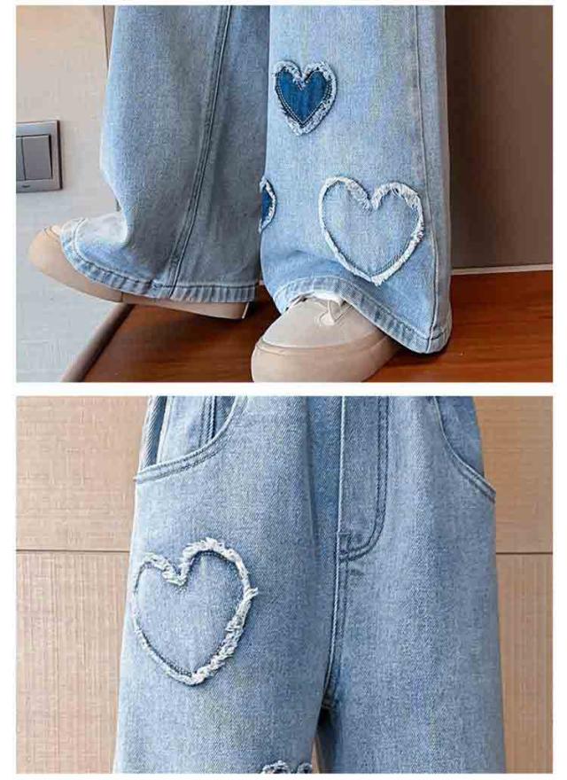 ジーンズ 子供服 デニムワイドパンツ 140 キッズ ワイドパンツ 女の子 デニムパンツ ハート キッズ デニム 女の子 かわいい 春秋 ウエストゴム 美脚 普段着 120 130 ロングパンツ 150 160 170