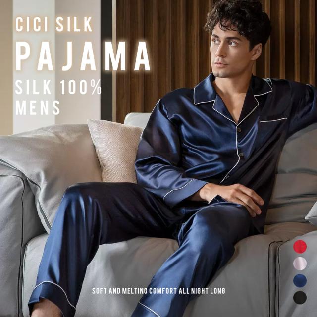 シルク パジャマ 長袖 メンズパジャマ Vネック 16匁 シルクパジャマ シルク100% 上下2点セット ルームウェア 春夏 上下セット セットアップ かわいい 部屋着 ナイトウェア 100%絹 男性 肌に優しい 潤い 寝巻き 無地 光沢感 プレゼント ギフト箱付き