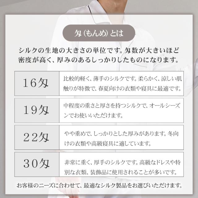 19匁 中程度の重さと厚さを持つシルクで、オールシーズンでお使いいただけます。