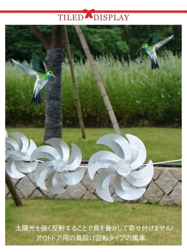 | アウトドア用の鳥除け回転タイプの風車. 太陽光を強く反射することで鳥を脅かして寄せ付けません! 鳥よけはシンプルなデザインを採用しておりますので、外観の雰囲気を損なうことなくインテリアの一つとしてご使用いただけます。 太くて厚手のナイロンロープは、高強度あり、優れた摩耗抵抗力と引裂き耐性を備えています。 風車の前後に結び目が付けられており、強風で風車が乱れて飛ばされるのを防ぎます。または、風車の間隔も調整可能。 簡易に設定でき、お庭、果樹園、池、公園、プール、畑などの様々な場所が利用できます。 | |