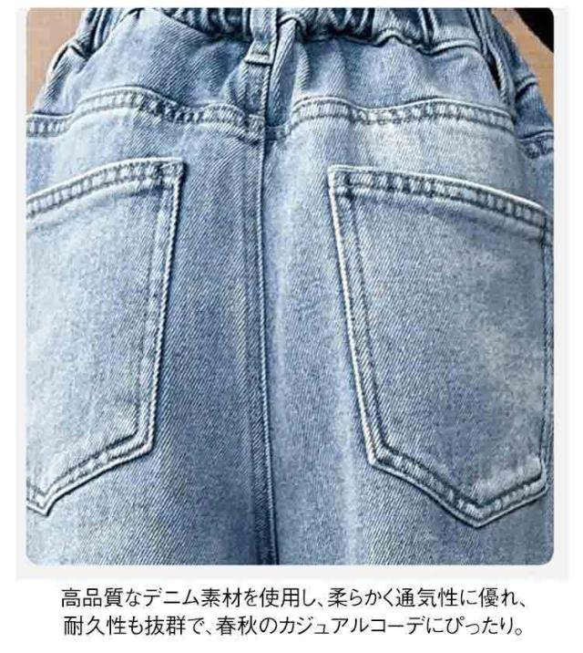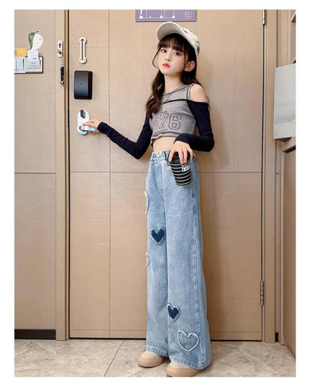 ロングパンツ デニムワイドパンツ ジュニア かわいい ハート キッズ デニム デニムパンツ 女の子 女の子 子供服 ワイドパンツ 美脚 春秋 ウエストゴム ジーンズ 普段着 120 130 140 150 160 170