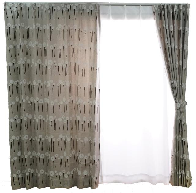 植物モチーフをボーダーに構成したカーテン。無風の中に整列したイメージ。一つ一つ少しずつ形が異なる愛らしい柄です。