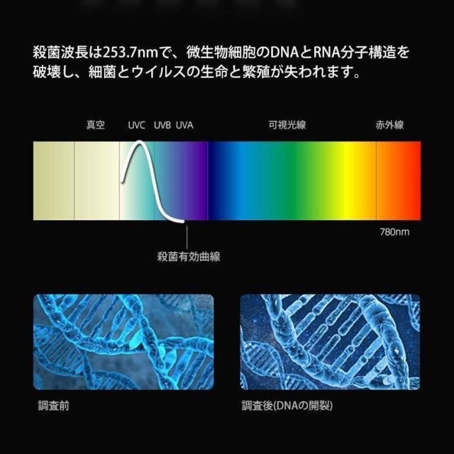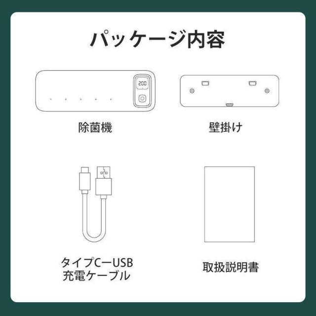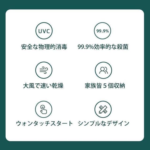 【使用方法】本体にUSBケーブルを接続し充電します。歯磨き後、洗い流した歯ブラシはタオル等で軽く水気を落とし除菌機本体に引っかけるだけ。一度に歯ブラシ5本分の除菌・殺菌ができます。カバーを閉じ電源ボタンを一度押すとタイマーがセットされ除菌が始まります。300秒(5分)間で除菌が終わり自動で電源が切れます。本体を取り外し丸洗いできます。月に1度を目安にお掃除しましょう。