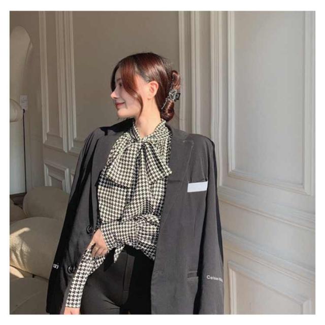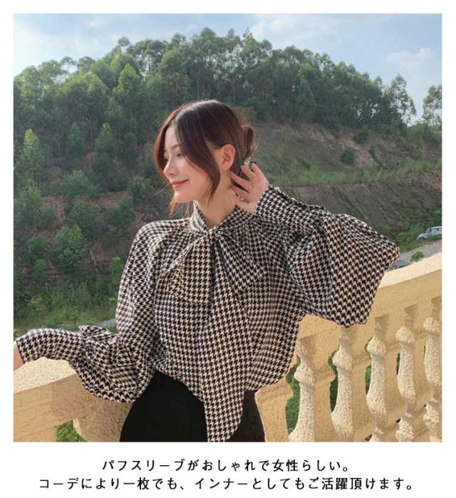 エレガント ボウタイブラウス リボン付き 上品 デート レディース おしゃれ 千鳥柄 長袖 千鳥柄 シャツ 可愛い 女性らしい ゆる感 着痩せ 着回し力 普段着 トップス 通勤 パフスリーブ 秋 冬 結婚式 入園式