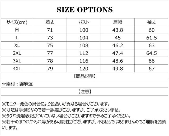 ▼サイズ:M/L/XL/2XL/3XL/4XL(単位:CM)