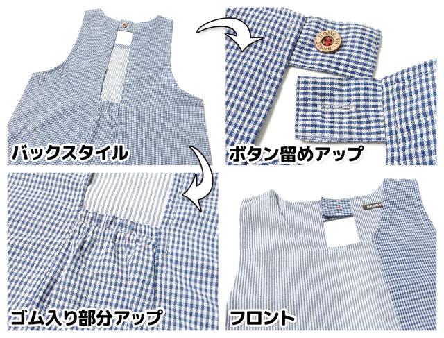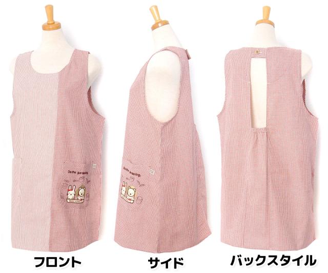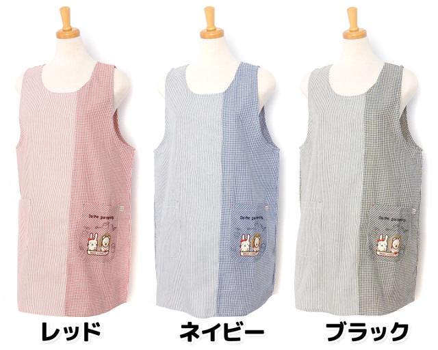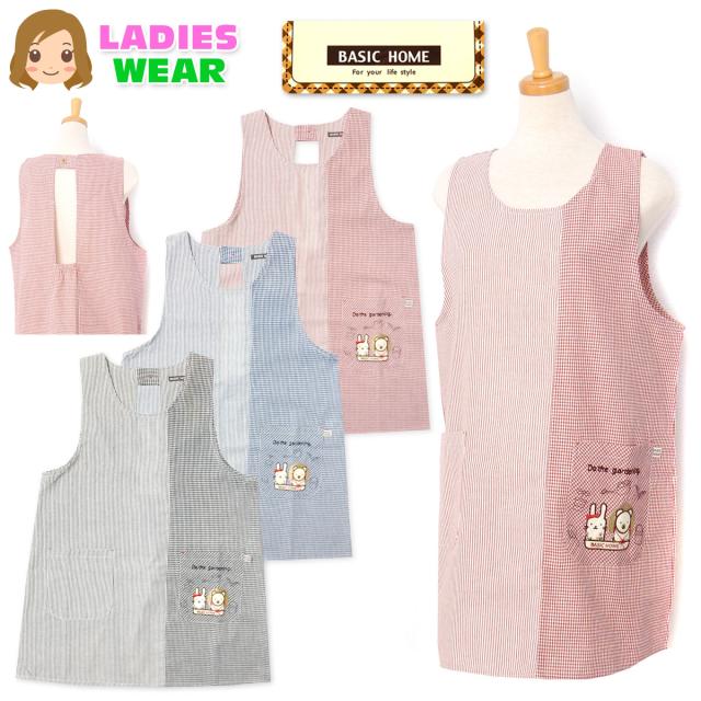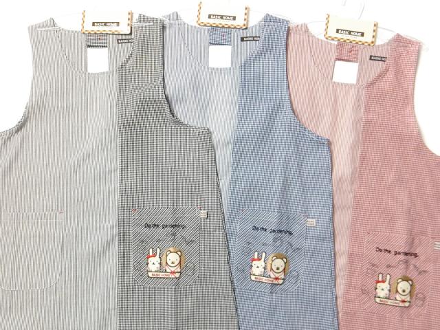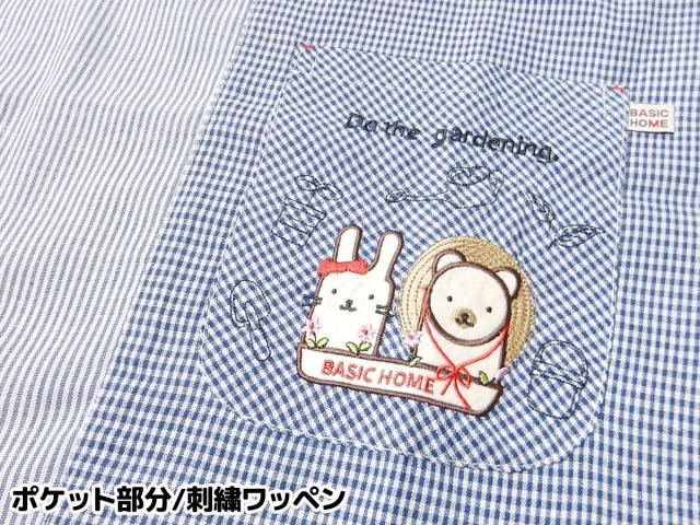 【送料無料】婦人 レディース ラン型 エプロン 後ろボタン&ゴムシャーリング ギンガムチェック ストライプ切替 うさぎ&くま刺繍ワッペン ポケット付き sl-0558【メール便対応】