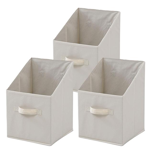 【カラーボックス対応】横向きに置いたカラーボックスに対応しているサイズ感の収納ボックスです。3個セットで、カラーボックスの引き出し収納として使うことができます。小物・衣類・おもちゃなど、様々なものを収納できます。 【上部ななめカット】隠す収納の時は上部が長い方を手前に、さっと取り出したい時や中身を見やすくしたい時は、上部が短い方を手前に、など使い分けることができます。 【棚やラックにも】カラーボックス以外にも、棚やラックの引き出し収納としてお使いいただけます。 【かんたん組み立て折りたたみ】本体を広げて底板を敷くだけのかんたん組み立てで、届いてすぐにお使いいただけます。使わない時はスリムに収納可能です。