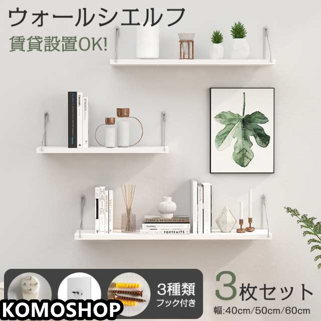 ウォールシェルフ 3枚セット 賃貸OK 壁掛け 40cm 50cm 60cm 取り付け簡単 石膏ボード 木製 飾り棚 収納棚 吊り