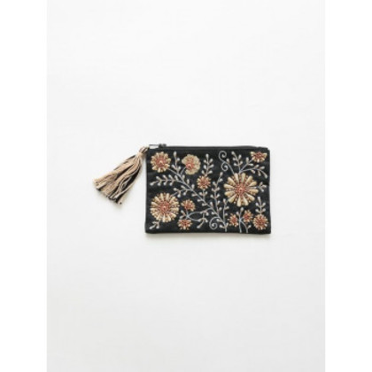 商品詳細:花柄のモチーフをビーズと機械刺繍で表現したポーチ。 生産国:インド 素材・材質:表地 ポリエステル100%裏地 綿100%、ビーズ 商品サイズ:10×15cm 重量:30g