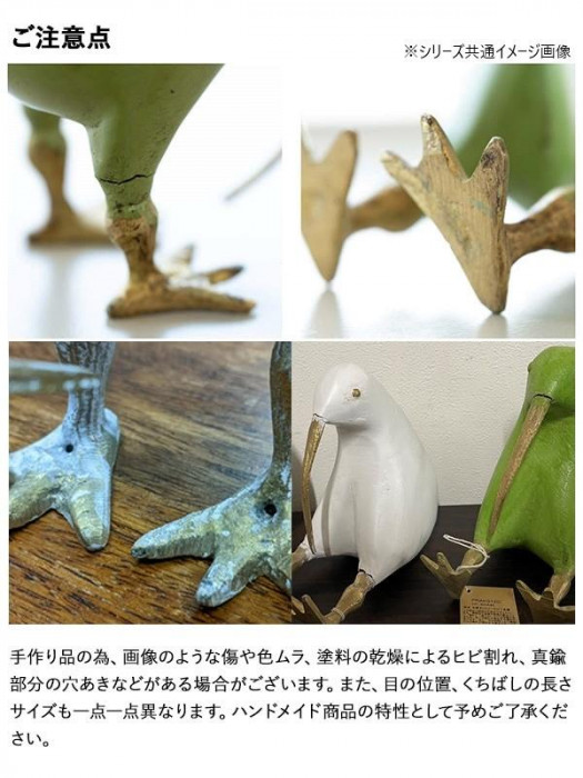 | 木製のボディに真鍮のくちばしと脚がついています。丸いフォルムと長いくちばしが、なんとも愛嬌があり人目をひきます。天然木のマンゴーウッドで作られておりちょこんと座ったり、2本足で立ったり2通りのキウイを楽しむことができます。 【ご注意点】 手作りの為、傷や色ムラ、塗装の乾燥によるヒビ割れ真鍮部分の穴開きなどがある場合がございます。また、目の位置、くちばしの長さ、サイズも1点、1点異なります。ハンドメイド商品の特性として予めご了承ください。 |