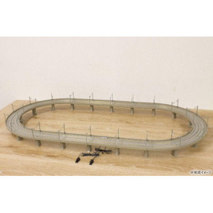 | PCトラック レールセットH 複線高架線セットは複線高架レイアウトを作る為に必要なレールがひとまとめになったセットです。複線高架を使用した、基本的なオーバルのレイアウトです。別売りのレールや高架橋、橋脚をご用意いただくことで、更に大きなレイアウトを製作することも可能です。本製品は新幹線各種や103系等の都市部を走った車両と組み合わせて楽しめるセットとなります。 橋脚パーツがより外れにくくなるためのラベルも付属します。 車両やコントローラーは別途お買い求めください。 ※セットを組み立てた時の寸法です。 |