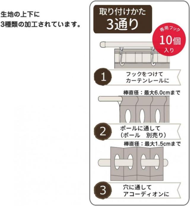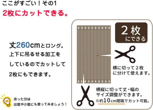 | カーテンでも、突っ張り棒でも使える特大パーティションです。縦横10cm単位でカットでき、サイズ調整もOK。袋縫い、レールのためのひっかけ、通し穴が生地の上下についており、横にカットして2枚にすることも可能です。昼夜でも室外から部屋を見えにくくなる遮像機能もついています。洗濯機はネット洗いか手洗いにて洗える。 ※こちらの商品には突っ張り棒は入っていません。 ※洗濯機に入れる場合は、ネットをご使用ください。 |