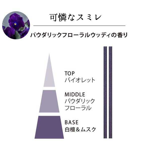商品詳細:香水香花の花 すみれは、可憐なパウダリックフローラルウッディの香り。可憐なバイオレットを中心としたやさしいフローラルブーケを、しっとりとしたパウダリックでアレンジし、東洋調の上質なインド産白檀と芳醇なムスク調の香りでまとめました。燃焼時間約20分の長寸タイプ。より長く香りをお楽しみいただけます。 生産国:日本 素材・材質:タブ粉、香料 商品サイズ:高さ160×幅45×奥行23mm、お香サイズ:約138mm 重量:約56g(箱含む) 仕様:燃焼時間:約20分