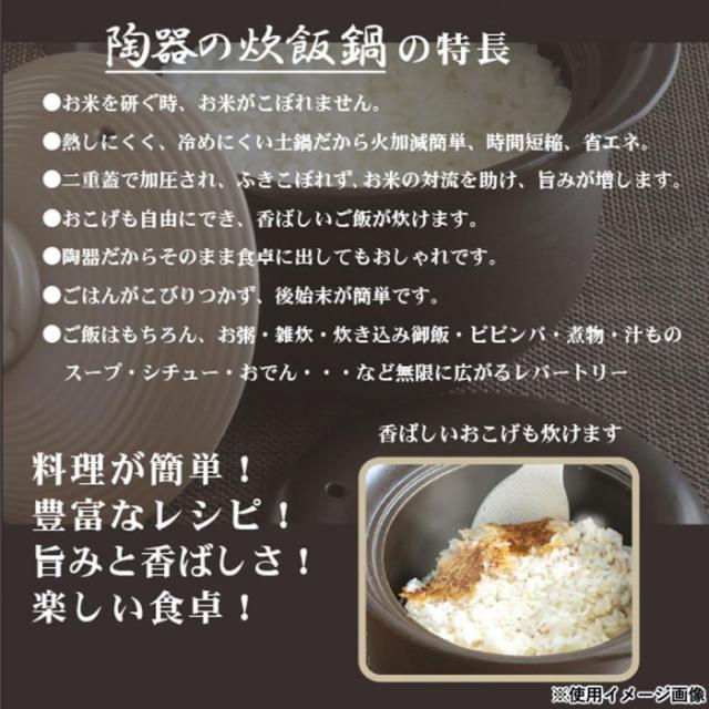 | 熱しにくく、冷めにくい土鍋だから火加滅簡単、時間短縮、省エネ!陶器だから、そのまま食卓に出してもおしゃれです。おこげも自由にでき、こうばしいご飯が炊けます。ごはんがこびり付かず、後始末が簡単です。ごはんはもちろん、お粥・雑炊・炊き込みご飯・ビビンバ・煮物・汁物・スープ・シチュー・おでんなど無限に広がるレパートリー!二重蓋で加圧され、吹きこぼれず、お米の対流を助け、旨みが増します。 |