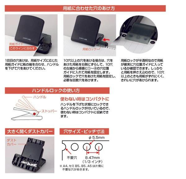 | ツイストリング・ノートをパワーアップ!データ・メモ・時刻表・地図等色々な書類もこのパンチで穴をあけてツイストリング・ノートに綴じることができます。抜き差し交換もカンタンなツイストリング・ノートをワタシだけのスマートノートに。 ※国際標準1/3インチ(8.47mm)ピッチ 丸穴 ※最大穿孔枚数:コピー用紙5枚(64g/m2)(JIS規格ピッチA4・30穴、B5・26穴、A5・20穴には対応していません。) |