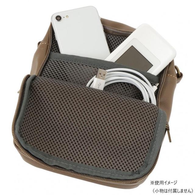 | スマホやガジェットを入れるのに嬉しいメッシュ層のポケットを付けました。オリジナルの型押しカシメがポイントに。付け替えが出来るショルダー2FACE仕様。ロゴ入りのベルトでトレンドっぽく合わせたり、本体共生地のショルダーでシンプルに合わせたり気分によって楽しめます。裏地にリサイクルポリエステル生地を使用しています。 |