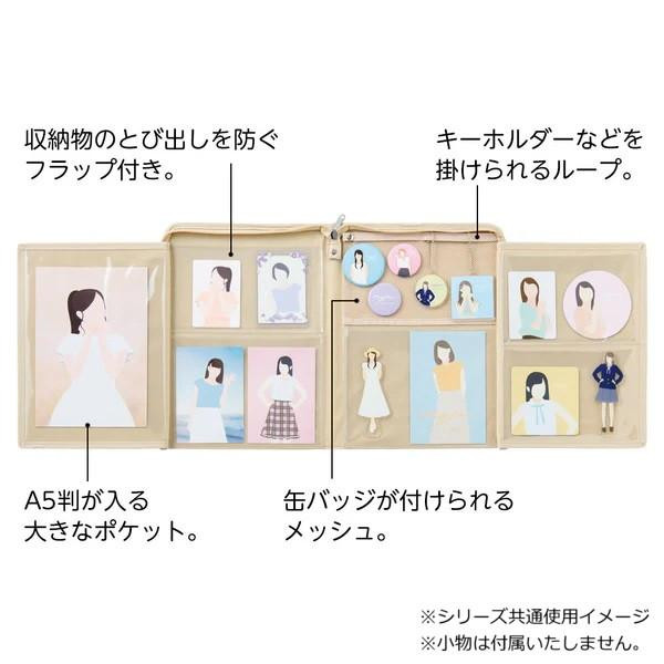 商品詳細:大切なコレクションをディスプレイでき、ファスナーを閉じるとスリムに収納できます。推しの祭壇としてコレクションを立てて飾れます。大きいポケットにはA5判が収納できます。小さいポケットには収納物のとび出しを防ぐフラップ付きです。ループ部分にはキーホルダーなどを掛けられ、メッシュ部分には缶バッジを付けることができます。 生産国:中国 素材・材質:本体:ポリエステル、ポケット:PVC 商品サイズ:225×20×300mm