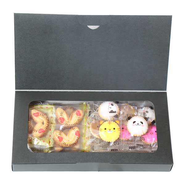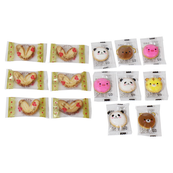 ちょっとしたプレゼントにピッタリな7種類の動物の柄がかわいいヨーチクラッカーと、サクサクっと美味しいミニサイズのハート型のパイのセットです。