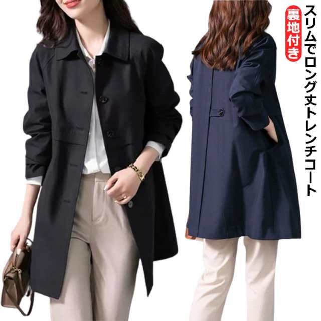 ステンカラーコート レディース トレンチコート ロング丈 春 秋 冬 ロングコート ビジネス コート 裏地付き 薄手 スリム きちんと 羽織り 大人 カジュアル 女性 通勤 通学 仕事 OL スプリングコート シンプル 黒 ブラック ネイビー 紺