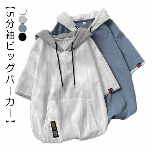 パーカー メンズ 薄手 夏 半袖パーカー フード付きtシャツ 大きいサイズ パーカーシンプル 部屋着 夏用 ルームウェア 韓国 ファッション 夏服 春夏 メンズファッション プルオーバーパーカー 切り替え トップス 5分袖 カジュアル 送料無料