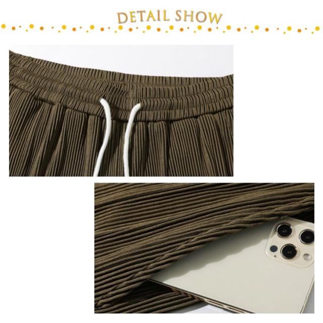 | ひらりと揺れて、リラックスたっぷり♪ やや光沢のあるサラリとした生地に、プリーツを施したふんわりと柔らかな肌触りが魅力です。 上下ともにゆとりのあるシルエットで、リラックスできる着用感。 ストンと落ち感のある生地、シワになりにくく、パジャマやワンマイルウェアとしてお勧め。 長ズボンはウェストゴムで、両サイドポケット付き、散歩など時小物を入れるのにとても便利。 接触冷感素材を採用する、サラリとした質感で、吸水性と通気性も抜群。 | |