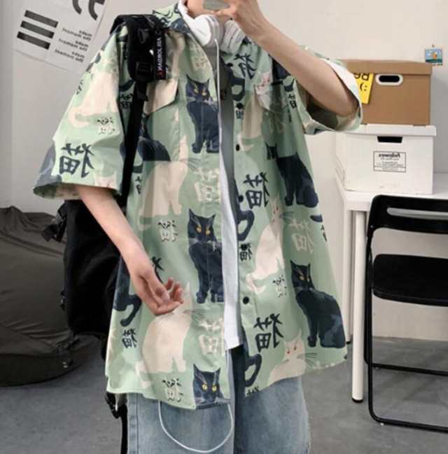 半袖シャツ 猫柄 メンズ トップス 薄手 アウター 羽織り ねこ プリント ねこ プリント 可愛い おもしろ 夏 アロハシャツ ビーチ カジュアル 通気 速乾 おしゃれ ストリート