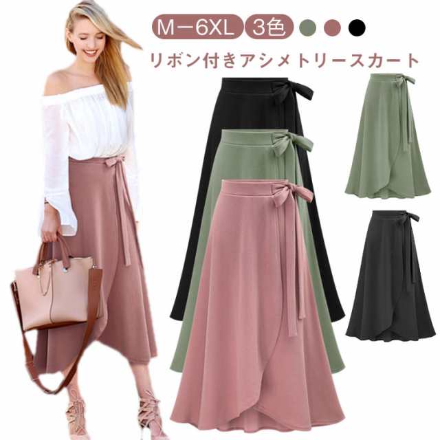 ニットスカート ロング 通勤 リボン付き アシメトリースカート ロングスカート スリット スカート Aライン キレイめ 秋冬 秋 30代 40代 大きサイズ