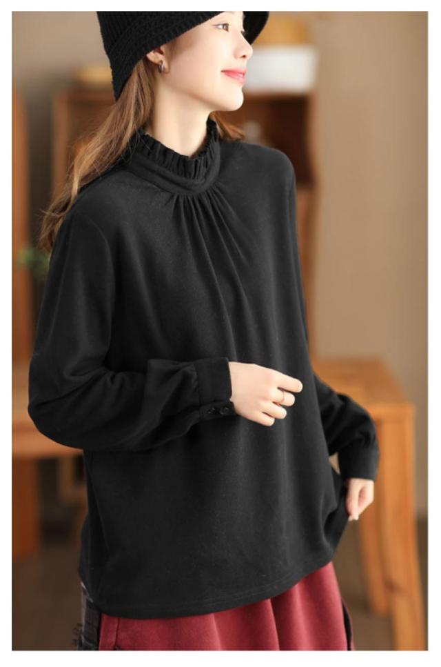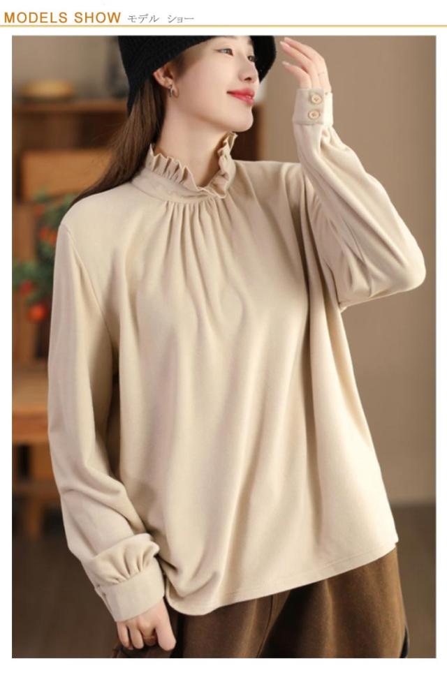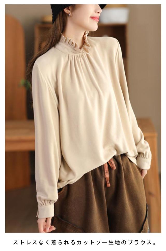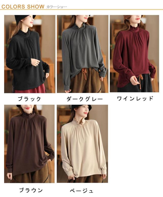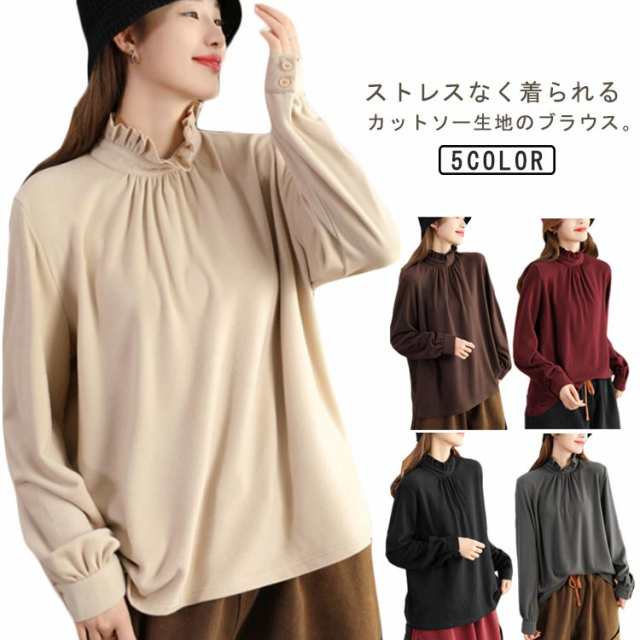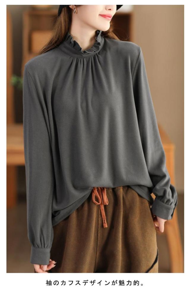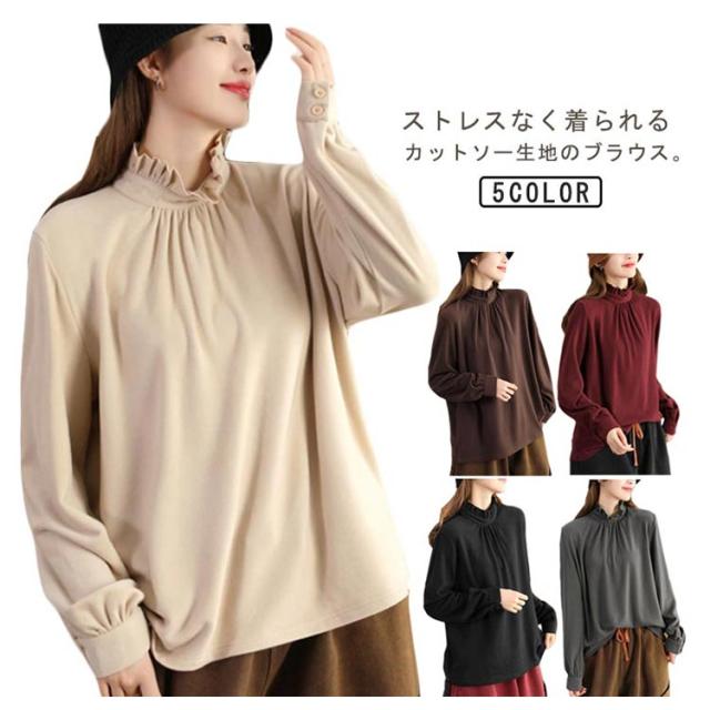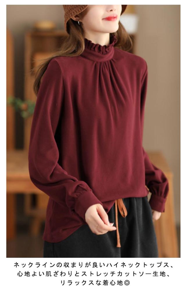 カットソー レディース インナー ハイネック 長袖 ブラウス Tシャツ フリルネック ギャザー ブラウス風 カジュアルシャツ カフス ハイネック ストレッチカットソー 40代 30代 50代 送料無料 立ち襟