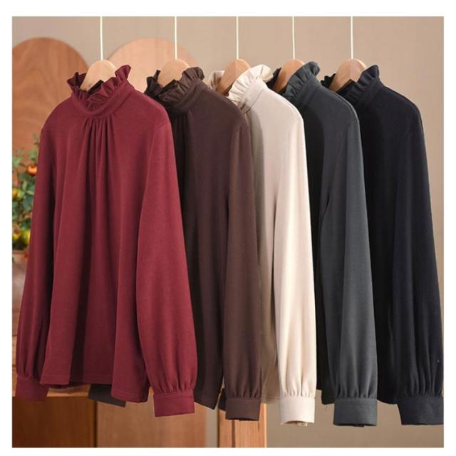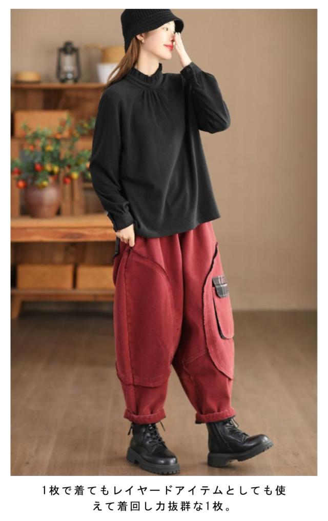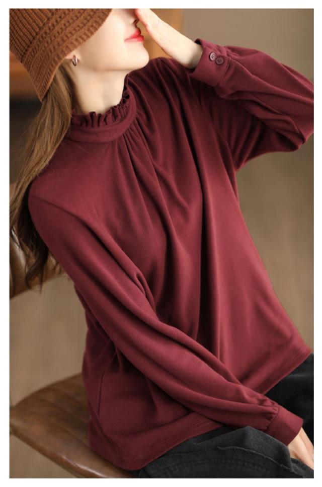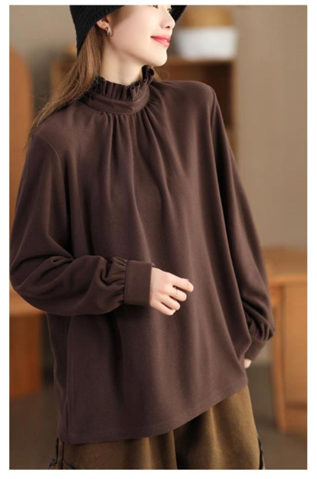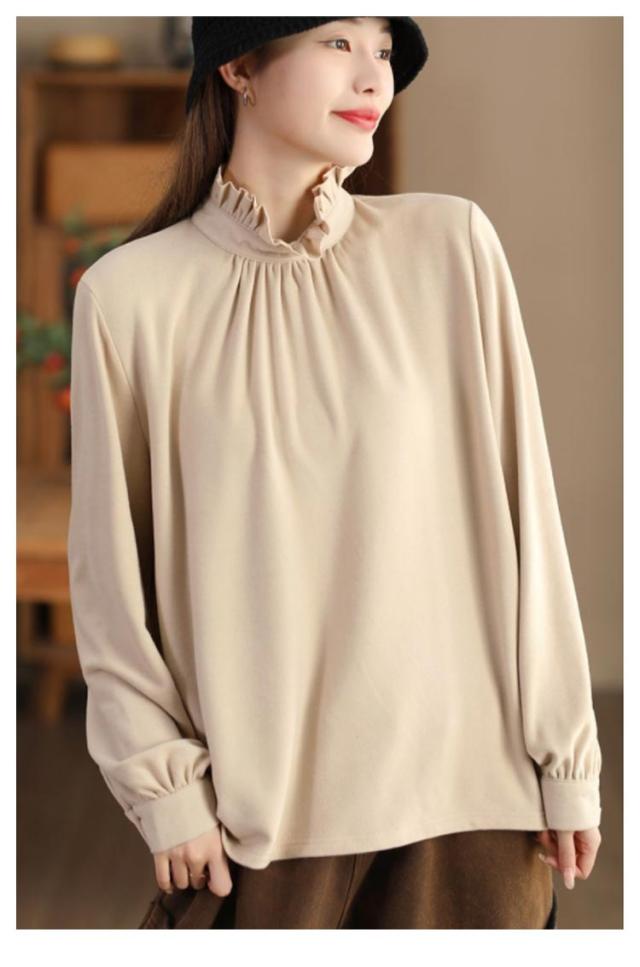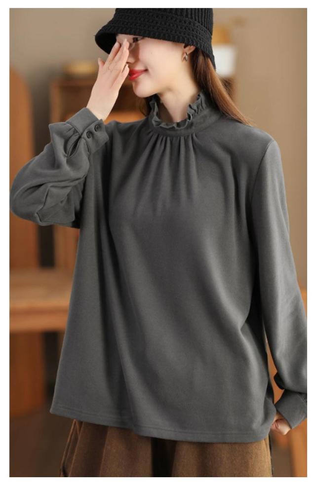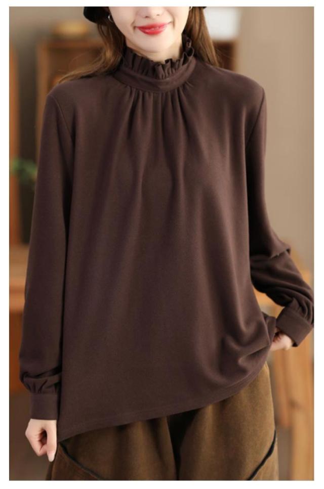 カットソー レディース インナー ハイネック 長袖 ブラウス Tシャツ フリルネック ギャザー ブラウス風 カジュアルシャツ カフス ハイネック ストレッチカットソー 40代 30代 50代 送料無料 立ち襟