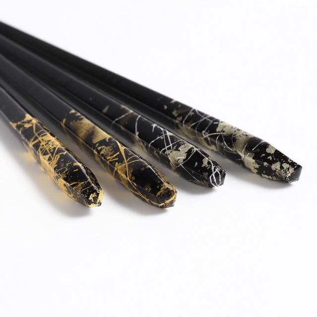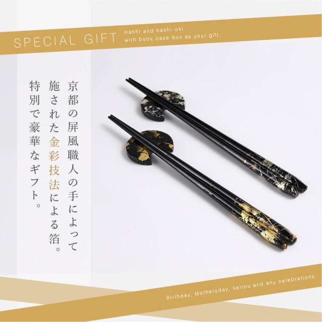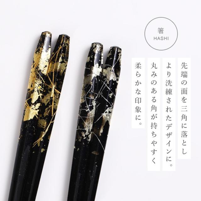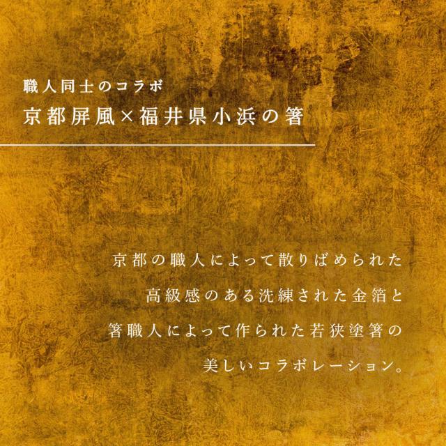 京都の箔加職人によって散りばめられた鮮やかな色彩の箔と、箸職人によって作られた若狭塗箸の美しいコラボレーション。