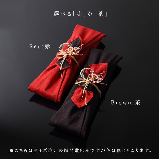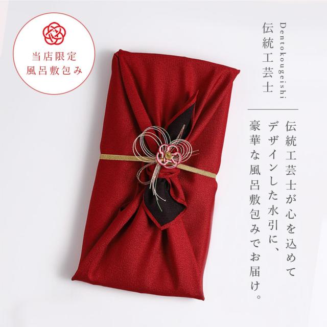 ギフトにも喜ばれる、ブックケース型の箱入り。伝統工芸士が心を込めてデザインした水引に豪華な風呂敷包みでお届け。風呂敷は「赤」か「茶」からカラーをお選びいただけます。