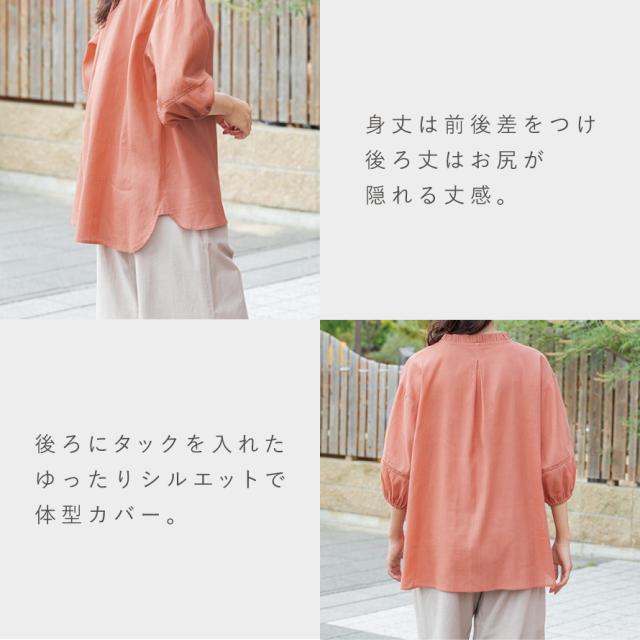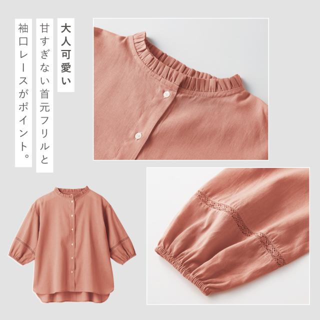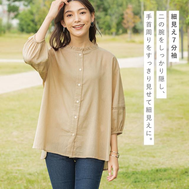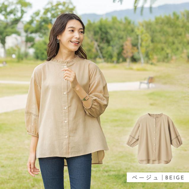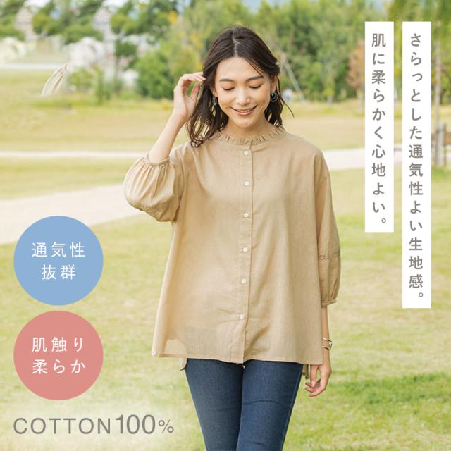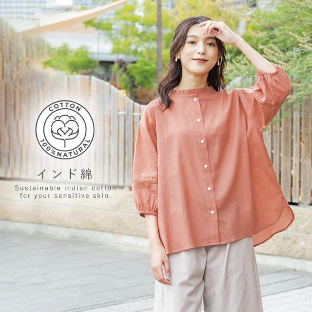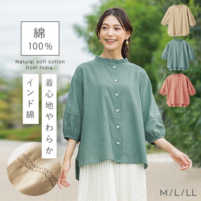 ブラウス スタンドカラー 七分袖 レディース ふんわり袖 フリル襟 綿100% コットン100% インド綿 敏感肌 エコテックス認証 きれいめ インド綿レース付ブラウス M L LL 大きいサイズ ゆったり 体型カバー おしりカバー 30代 40代 50代 メール便対応