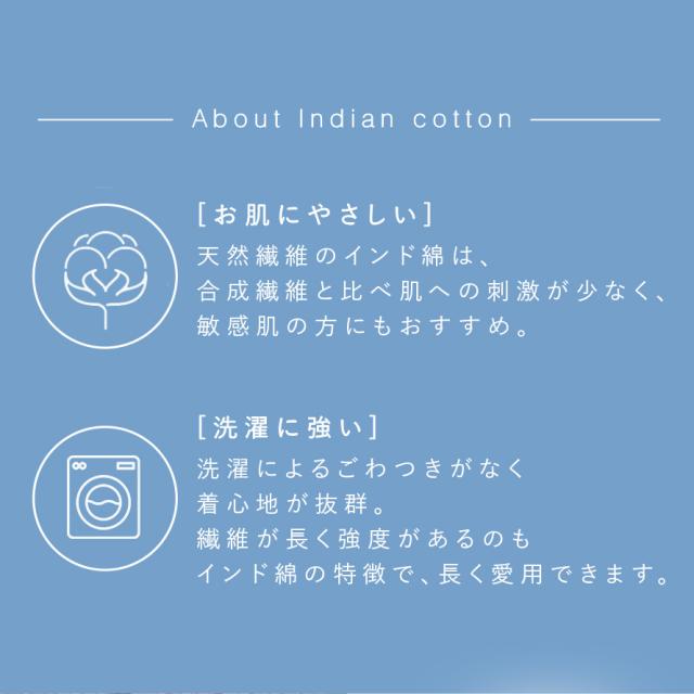 天然繊維のインド綿は、合成繊維と比べて肌への刺激が少なく、敏感肌の方にもおすすめです。