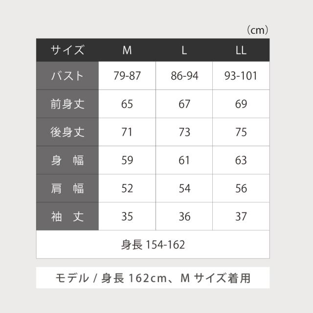 ■サイズ:身長154-162、M/バスト79-87、前身丈65、後身丈71、身幅59、肩幅52、袖丈35、L/バスト86-94、前身丈67、後身丈73、身幅61、肩幅54、袖丈36、LL/バスト93-101、前身丈69、後身丈75、身幅63、肩幅56、袖丈37cm