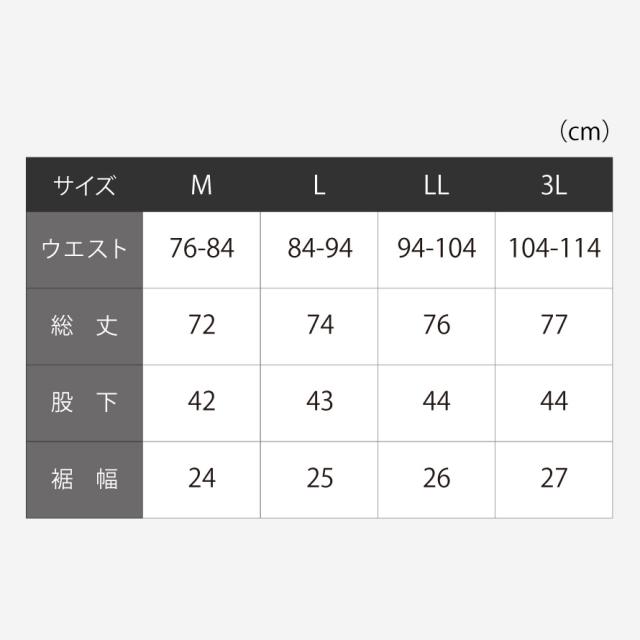 ■サイズ:M/ウエスト76-84、総丈72、股下42、裾幅24、L/ウエスト84-94、総丈74、股下43、裾幅25、LL/ウエスト94-104、総丈76、股下44、裾幅26、3L/ウエスト104-114、総丈77、股下44、裾幅27cm