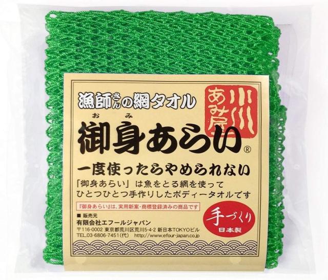 漁師さんの網タオル 御身あらい(グリーン)は、海で使う本物の魚網で製造したボディタオルです。耐久性は抜群で水切れがよく、泡立ちに優れ、衛生的、両手ひもがついているので、体のすみずみまで簡単に洗え、網目が心地よい刺激となって快適なバスタイムがお楽しみいただけます。