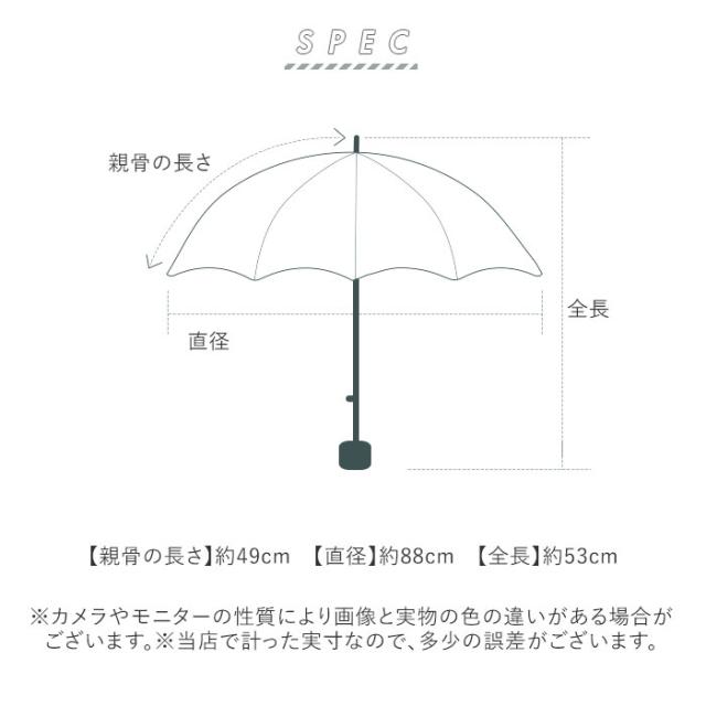 | サイズ | [親骨の長さ]約49cm/[直径]約88cm/[全長]約53cm [収納時の長さ]約24cm [収納時の幅]約6cm ※サイズは当店計測の実寸サイズです。実際の商品ならびにメーカー表記サイズとは多少の誤差が生じる場合がございます。あらかじめご了承ください。 |
